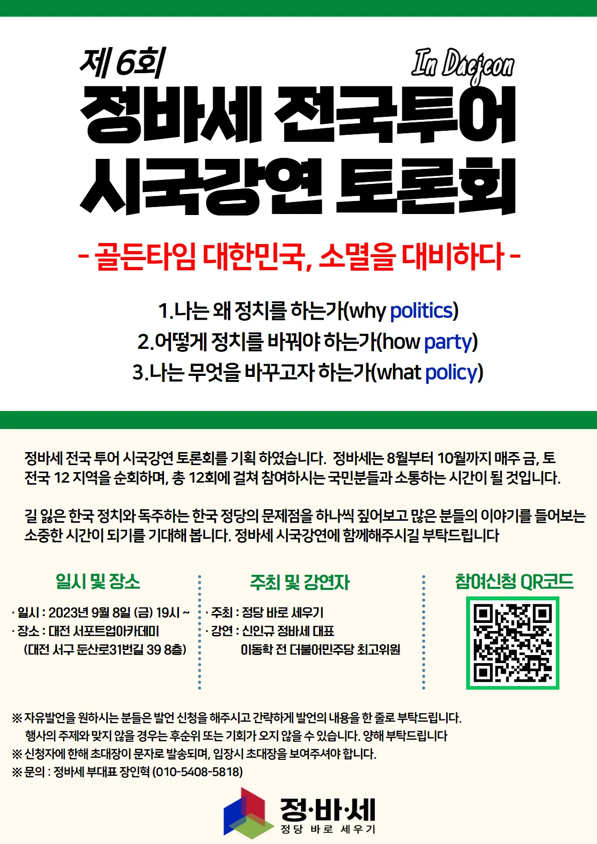 길 잃은 한국 정치와 독주하는 한국 정당의 문제점을 하나씩 짚어보고 많은 분들의 이야기를 들어보는 소중한 시간이 되기를 기대해 봅니다. 정바세 시국강연에 함께해주시길 부탁드립니다.