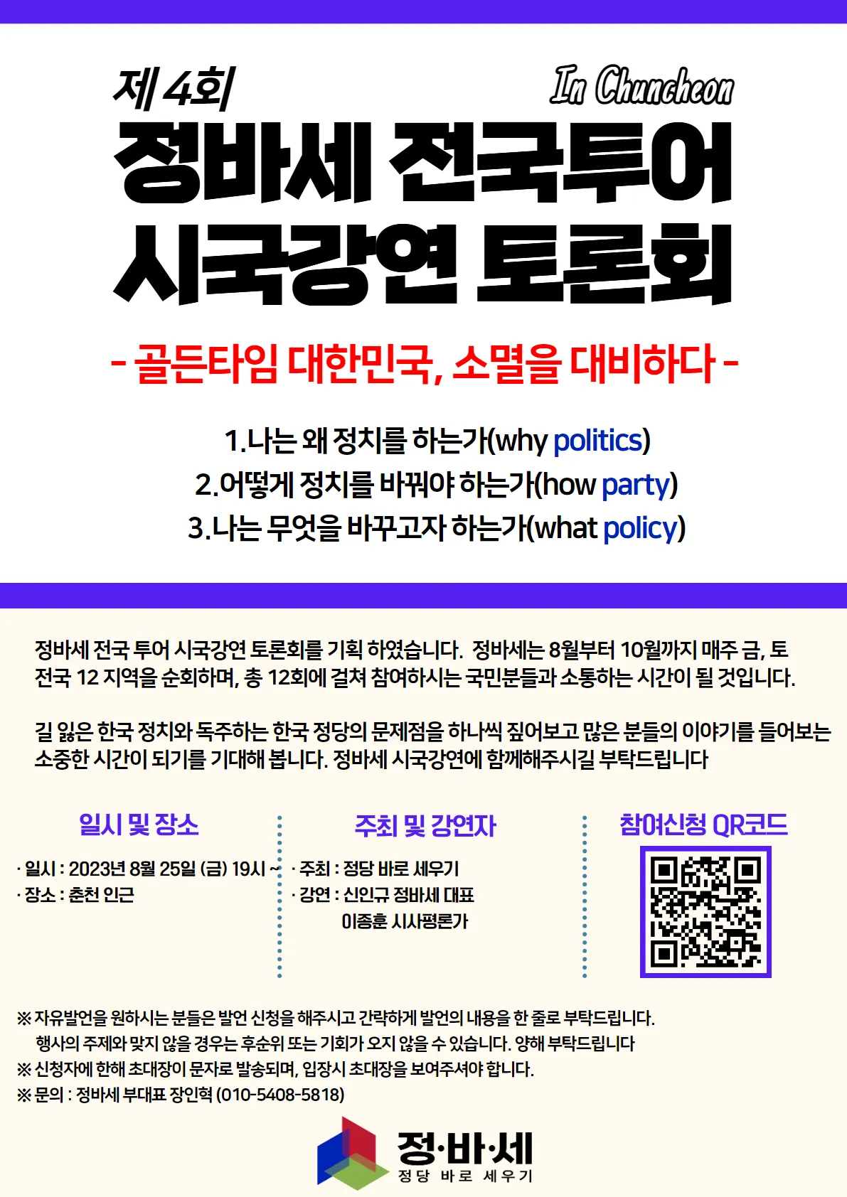 정바세 전국 투어 시국강연 토론회를 기획 하였습니다. 정바세는 8월부터 10월까지 매주 금, 토 전국 12 지역을 순회하며, 총 12회에 걸쳐 참여하시는 국민분들과 소통하는 시간이 될 것입니다.