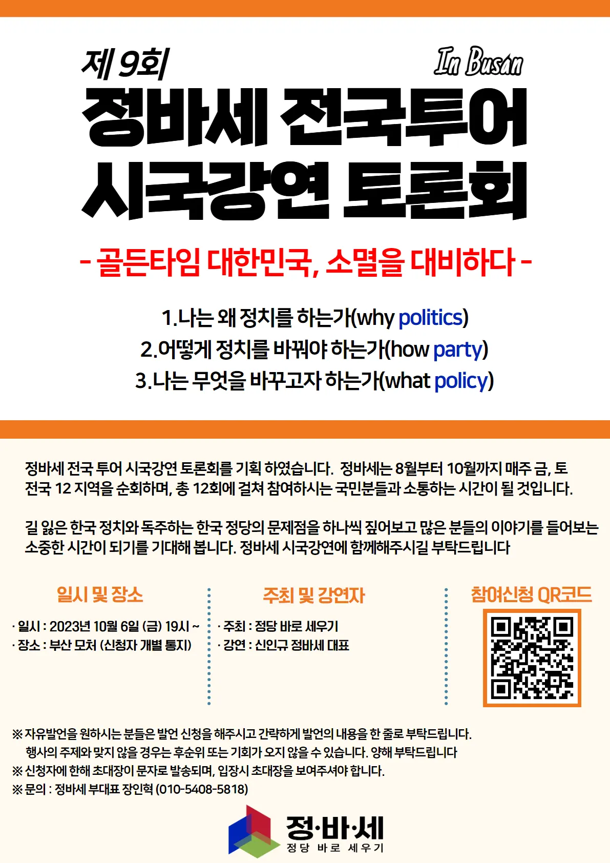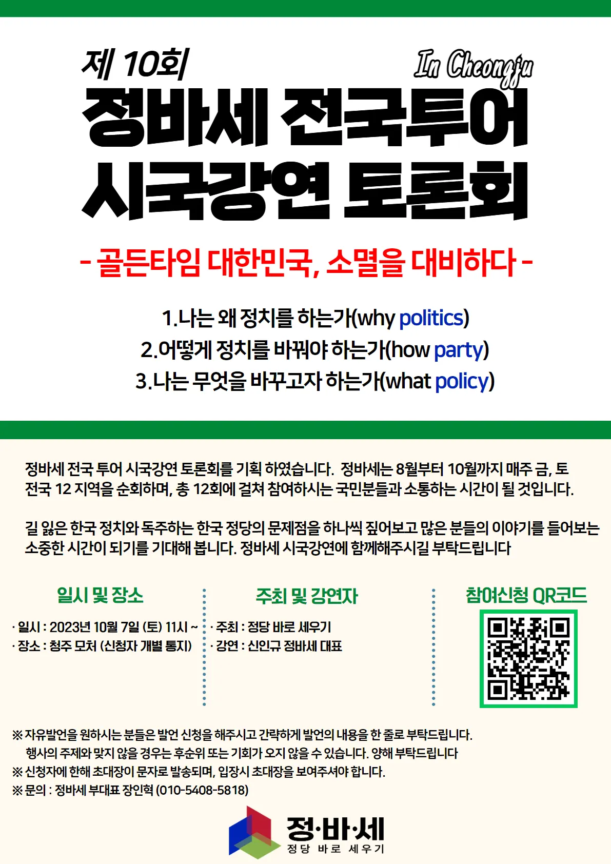 정바세 전국 투어 시국강연 토론회를 기획 하였습니다. 정바세는 8월부터 10월까지 매주 금, 토 전국 12 지역을 순회하며, 총 12회에 걸쳐 참여하시는 국민분들과 소통하는 시간이 될 것입니다.