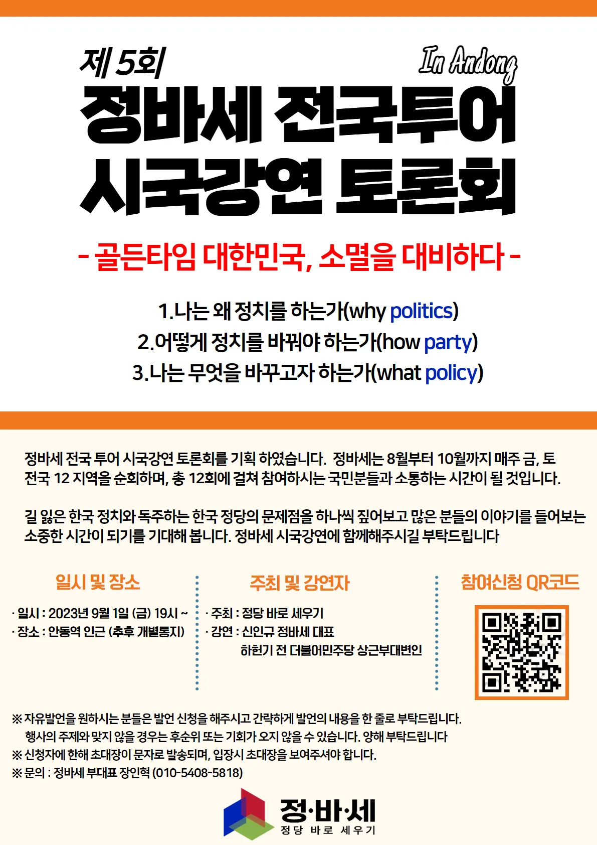 길 잃은 한국 정치와 독주하는 한국 정당의 문제점을 하나씩 짚어보고 많은 분들의 이야기를 들어보는 소중한 시간이 되기를 기대해 봅니다. 정바세 시국강연에 함께해주시길 부탁드립니다.